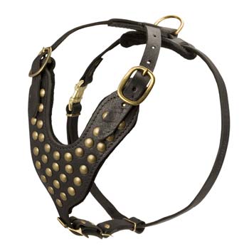 Do you know that right harness is a perfect training tool? Duly harnessed dogs are more obedient and easier trainable. Harnessing is a beneficial measure-best solution of any behavior problem. You are likely to choose the personalized dog harness you see here. It is a designer work. Do you like studs? You have got studs! Fashionable Leather Dog Harness With Half Ball Gold Colored Studs is a good choice for Pitbull dog breed. Studs look prettily against leather body. If you find this harness appropriate for your dog you will never have problems with his handling. The best dog harness for walking is constructed with successful dog training in mind but at the same time to make your dog a celebrity of your city (town). No dog can look better than that wearing such a harness!